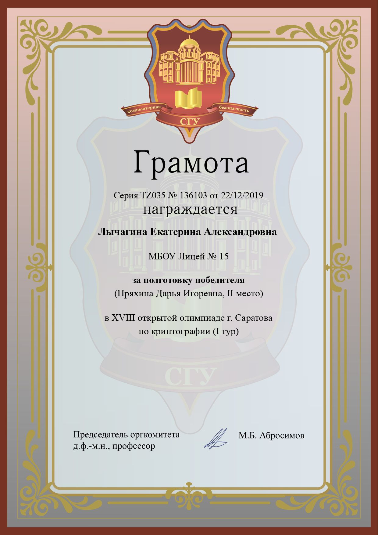 Название конкурса: XVIII открытая олимпиада г. Саратова по криптографии (I тур)Участник: Пряхина Дарья Игоревна
