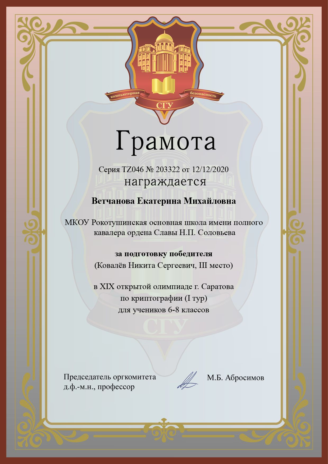 Название конкурса: XIX открытая олимпиада г. Саратова по криптографии (I тур)Участник: Ковалёв Никита Сергеевич