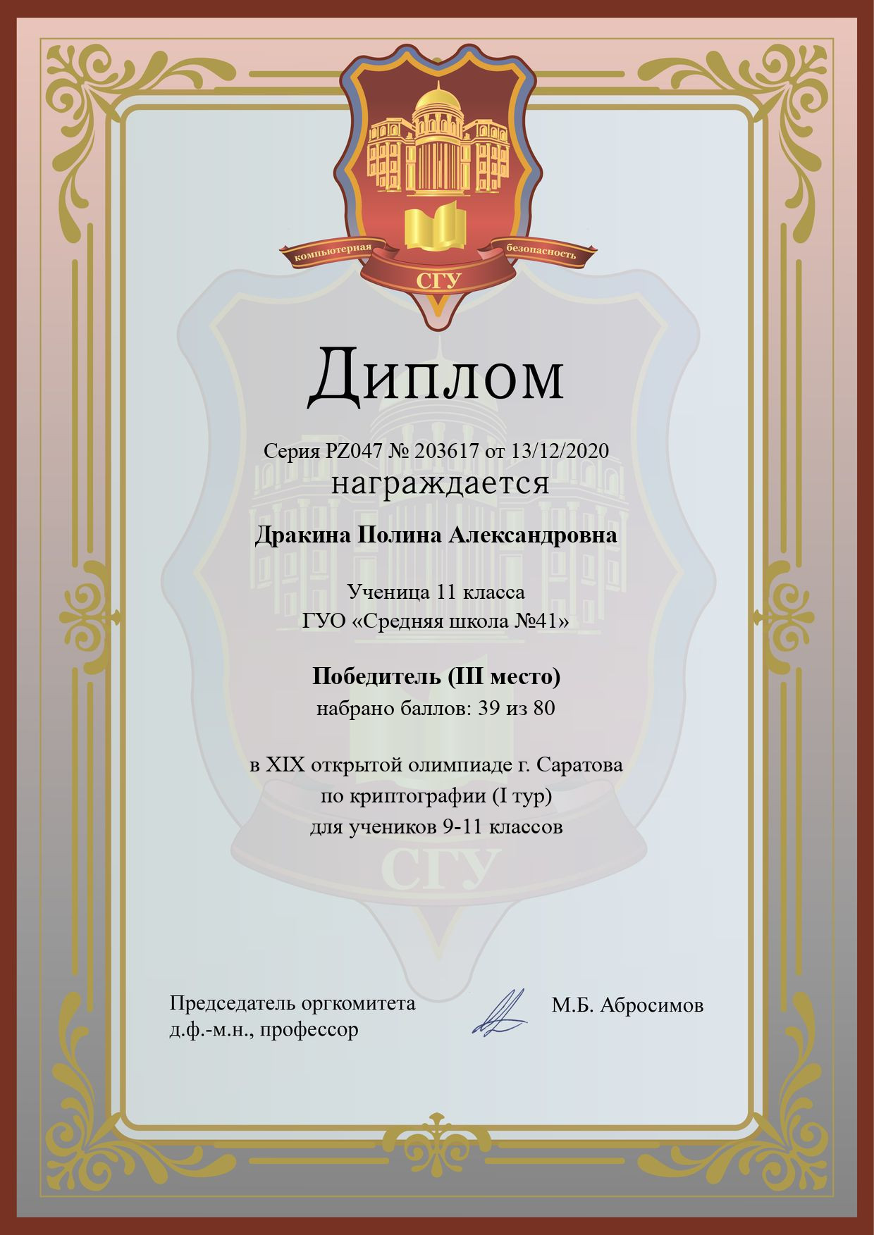 Название конкурса: XIX открытая олимпиада г. Саратова по криптографии (I тур)Участник: Дракина Полина Александровна