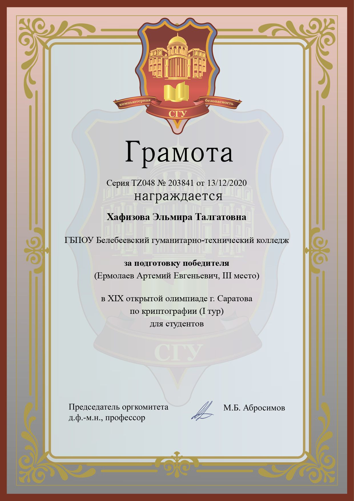 Название конкурса: XIX открытая олимпиада г. Саратова по криптографии (I тур)Участник: Ермолаев Артемий Евгеньевич