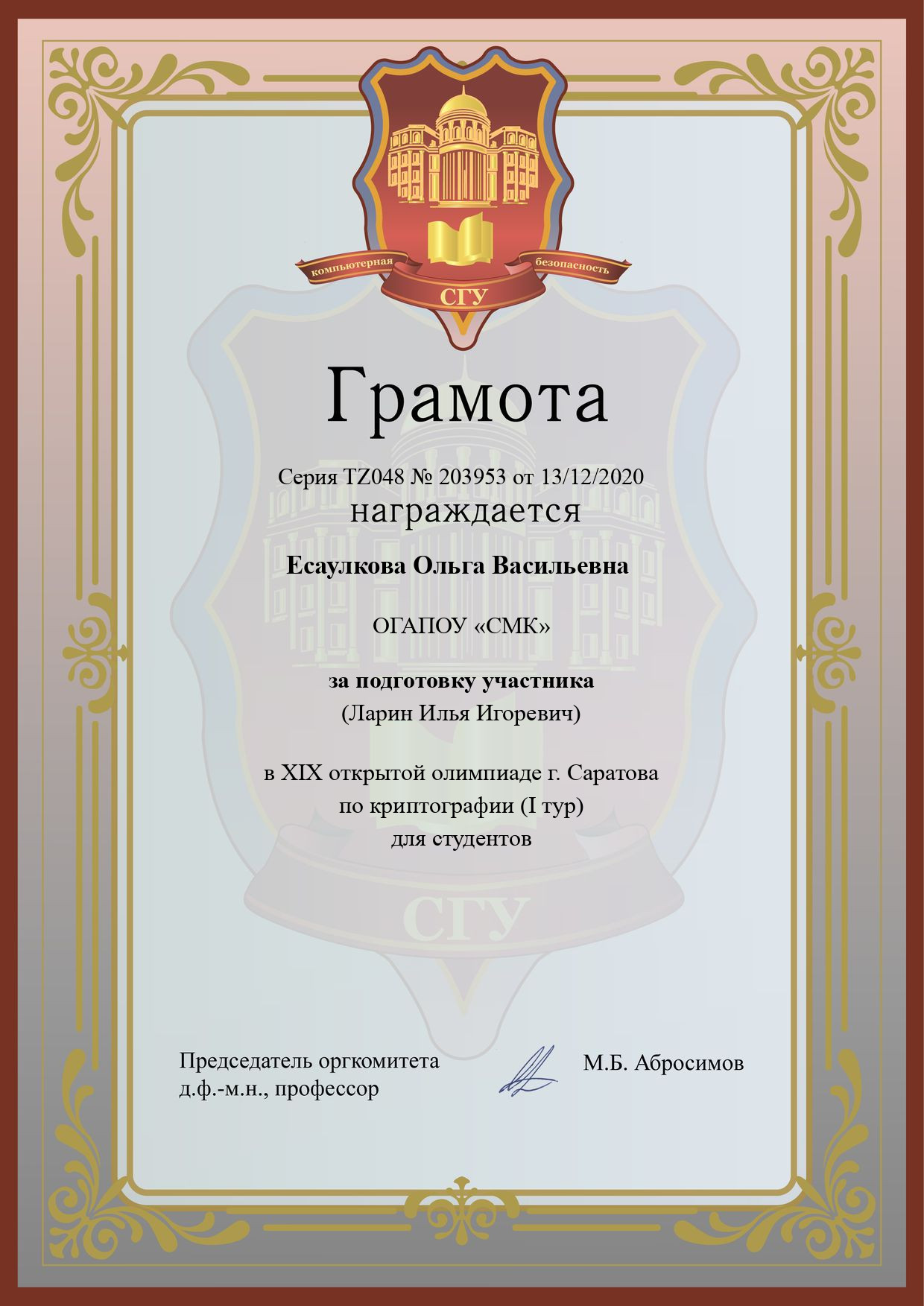 Название конкурса: XIX открытая олимпиада г. Саратова по криптографии (I тур)Участник: Ларин Илья Игоревич