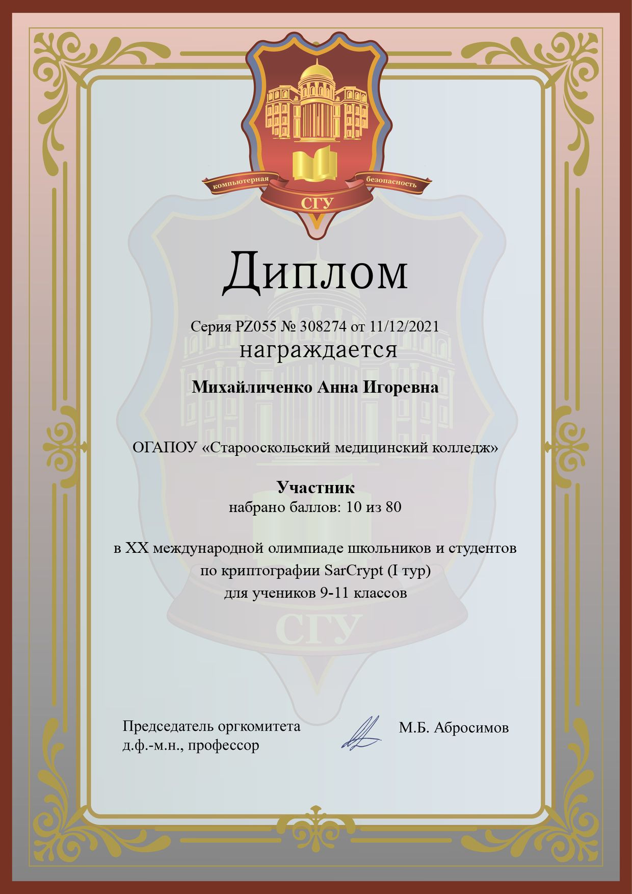 Название конкурса: XX открытая олимпиада школьников и студентов по криптографии (I тур)Участник: Михайличенко Анна Игоревна
