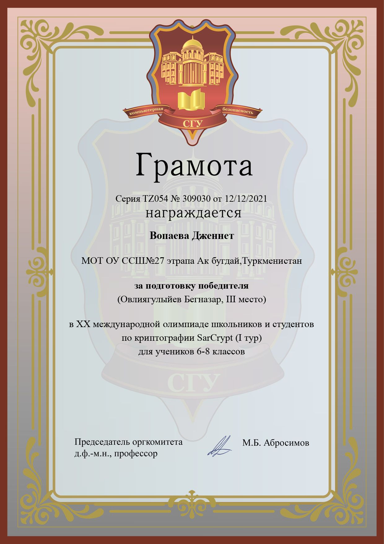 Участник: Овлиягулыйев Бегназар