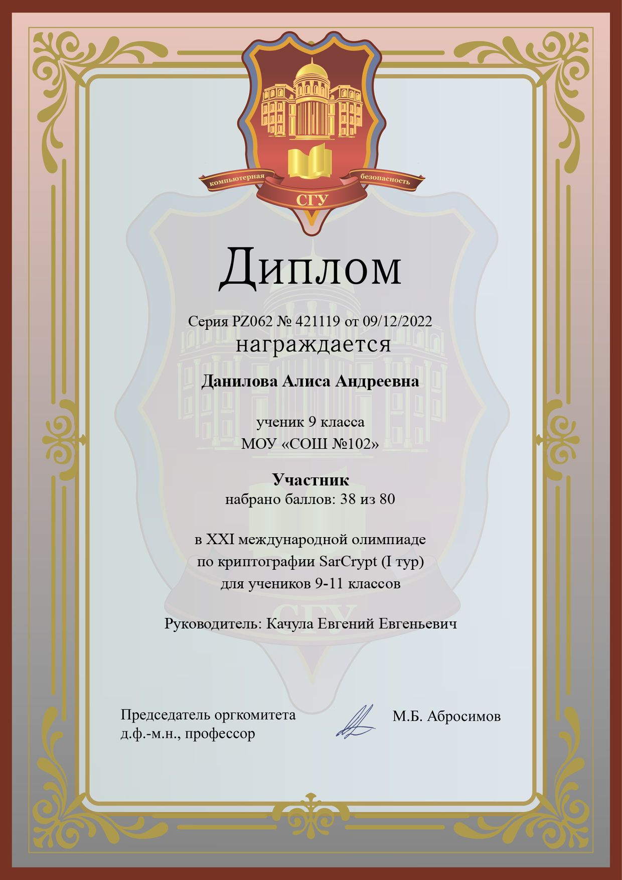 Название конкурса: XXI открытая олимпиада школьников и студентов по криптографии (I тур)Участник: Данилова Алиса Андреевна