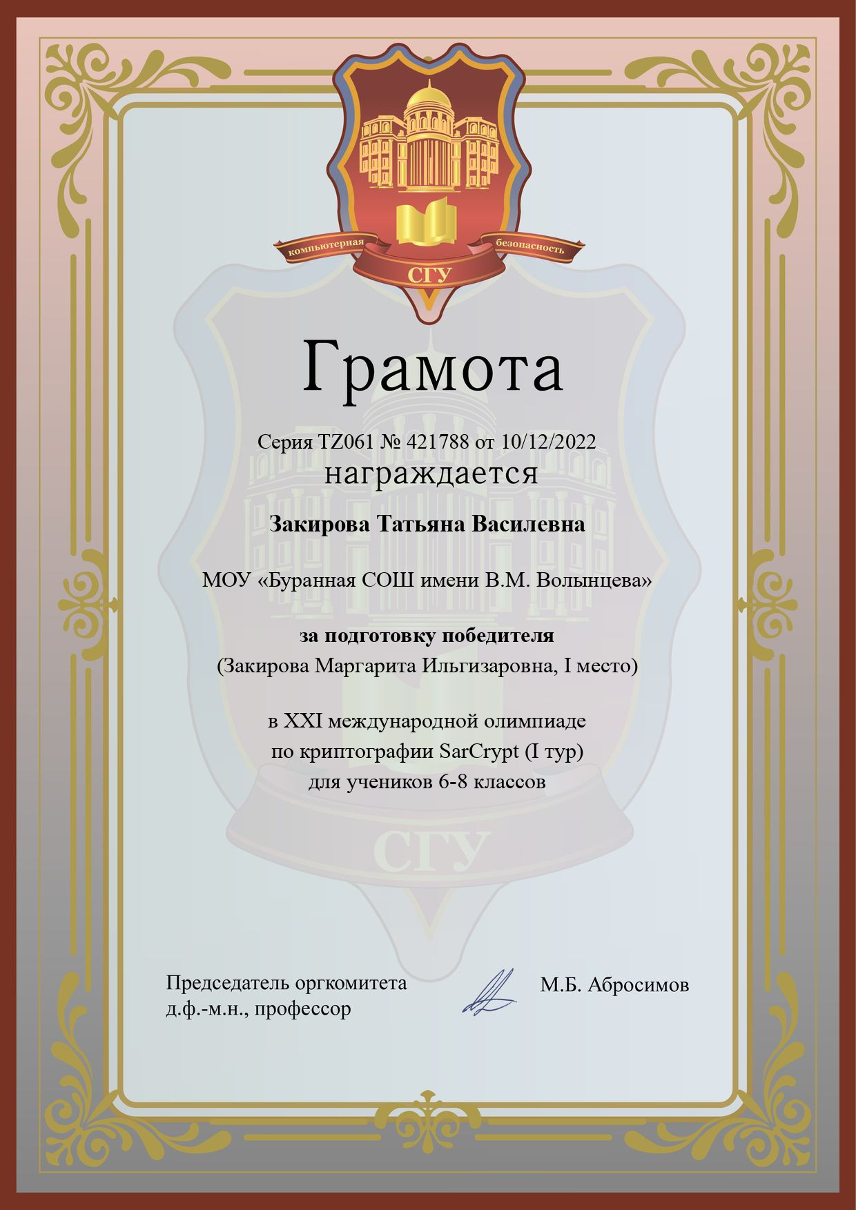 Название конкурса: XXI открытая олимпиада школьников и студентов по криптографии (I тур)