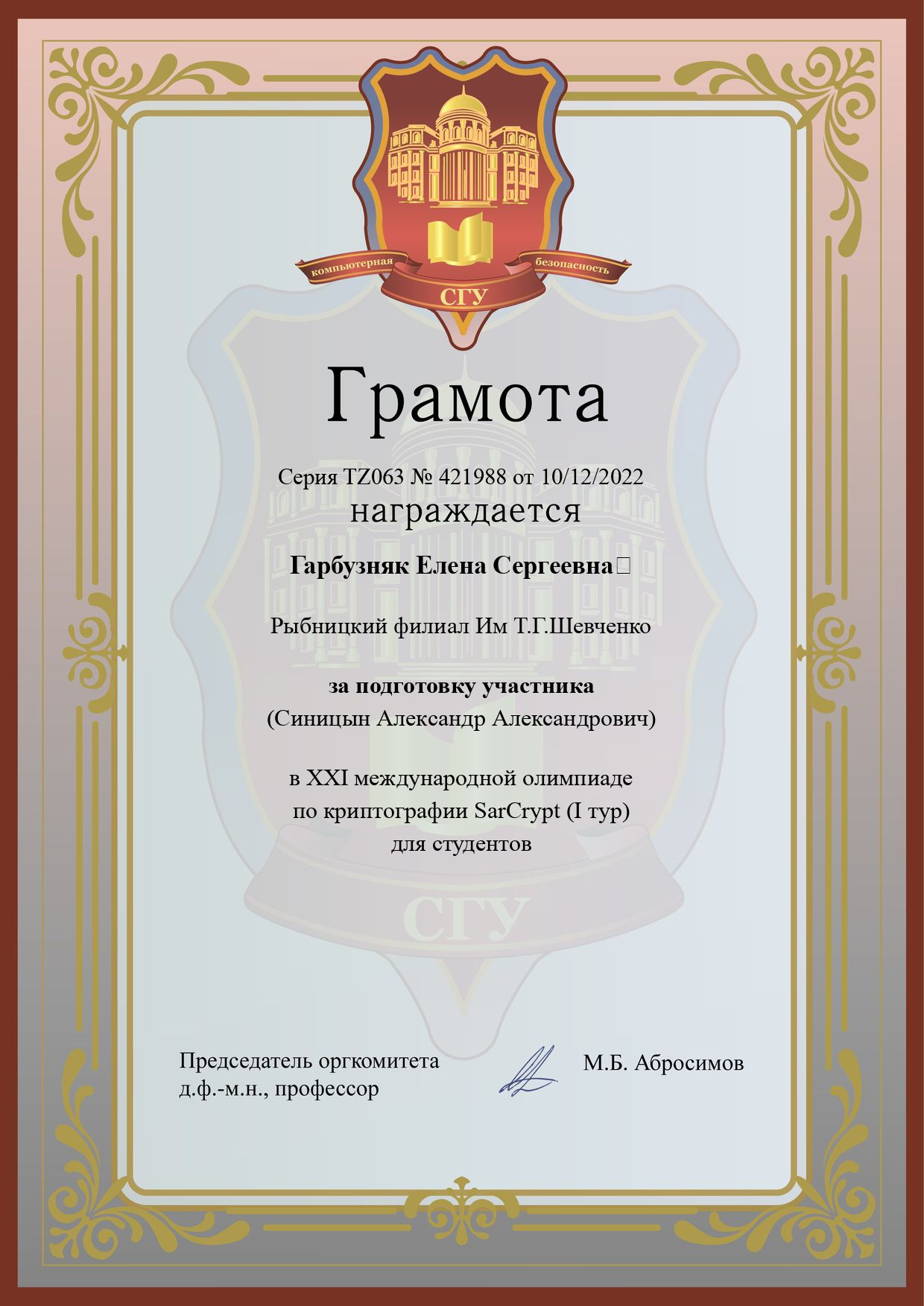Название конкурса: XXI открытая олимпиада школьников и студентов по криптографии (I тур)Участник: Синицын Александр Александрович