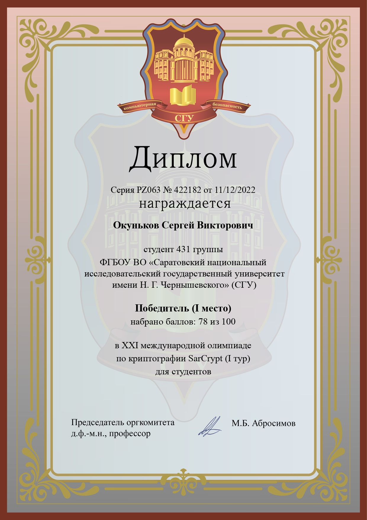 Название конкурса: XXI открытая олимпиада школьников и студентов по криптографии (I тур)Участник: Окуньков Сергей Викторович
