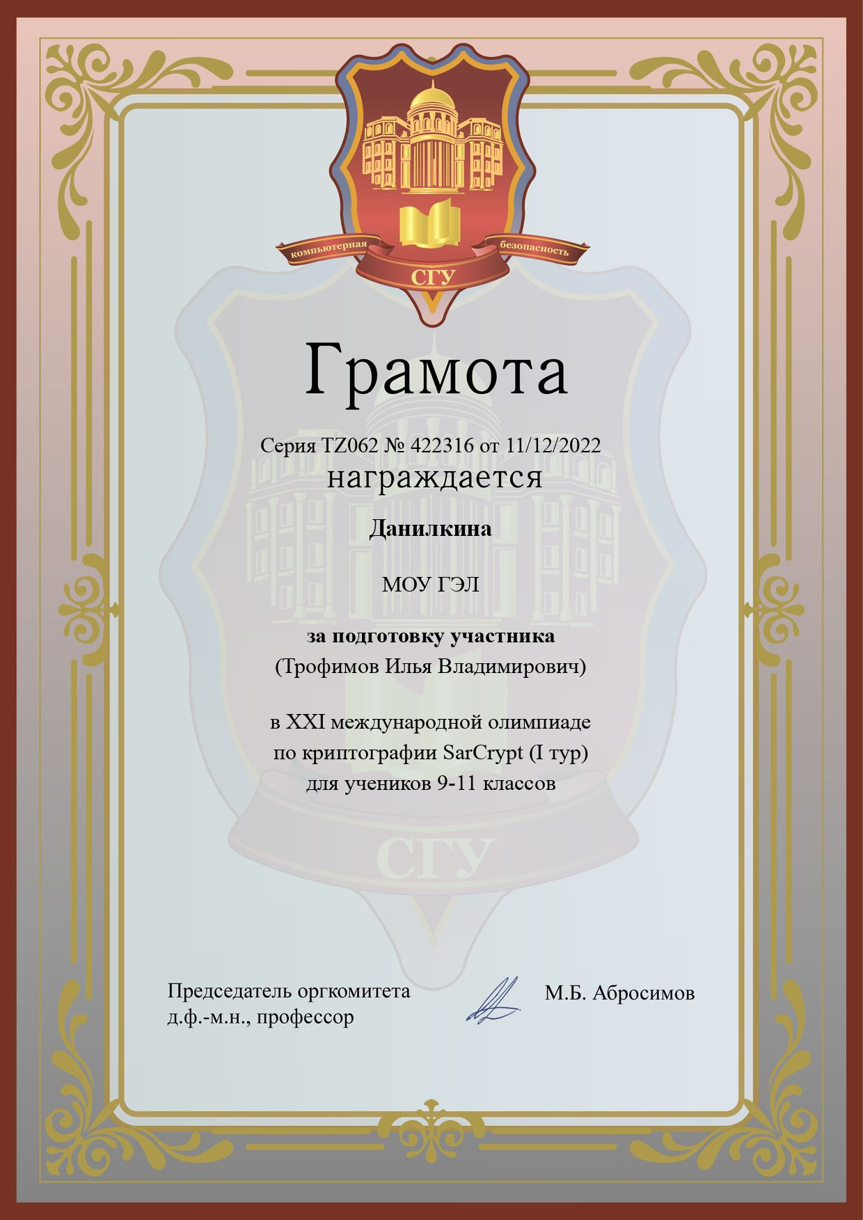 Название конкурса: XXI открытая олимпиада школьников и студентов по криптографии (I тур)Участник: Трофимов Илья Владимирович