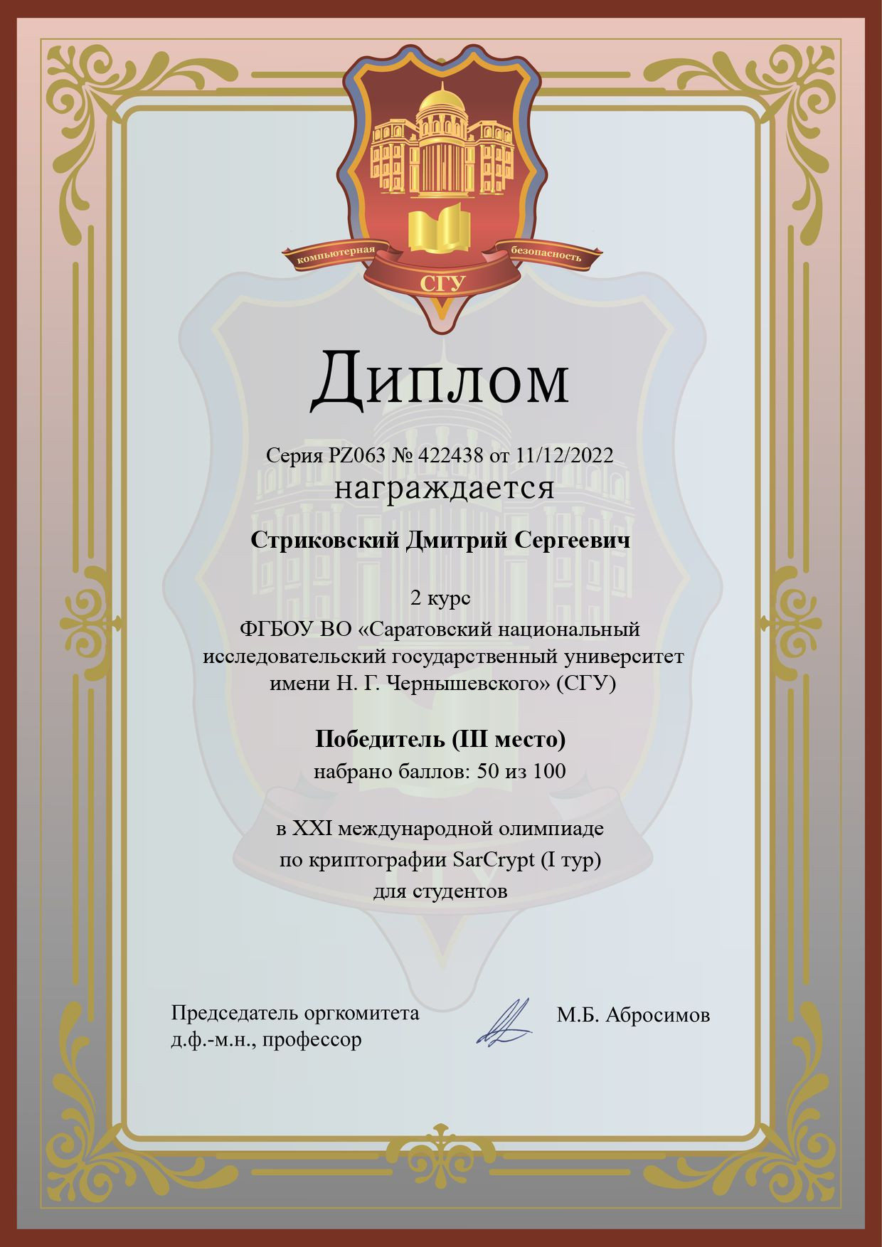 Название конкурса: XXI открытая олимпиада школьников и студентов по криптографии (I тур)Участник: Стриковский Дмитрий Сергеевич