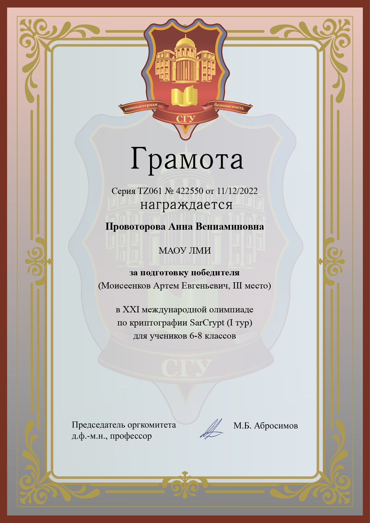 Название конкурса: XXI открытая олимпиада школьников и студентов по криптографии (I тур)Участник: Моисеенков Артем Евгеньевич