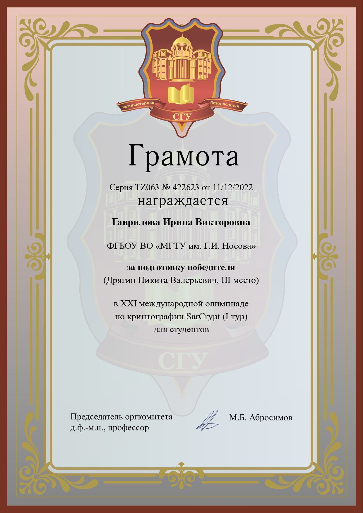 Название конкурса: XXI открытая олимпиада школьников и студентов по криптографии (I тур)Участник: Дрягин Никита Валерьевич