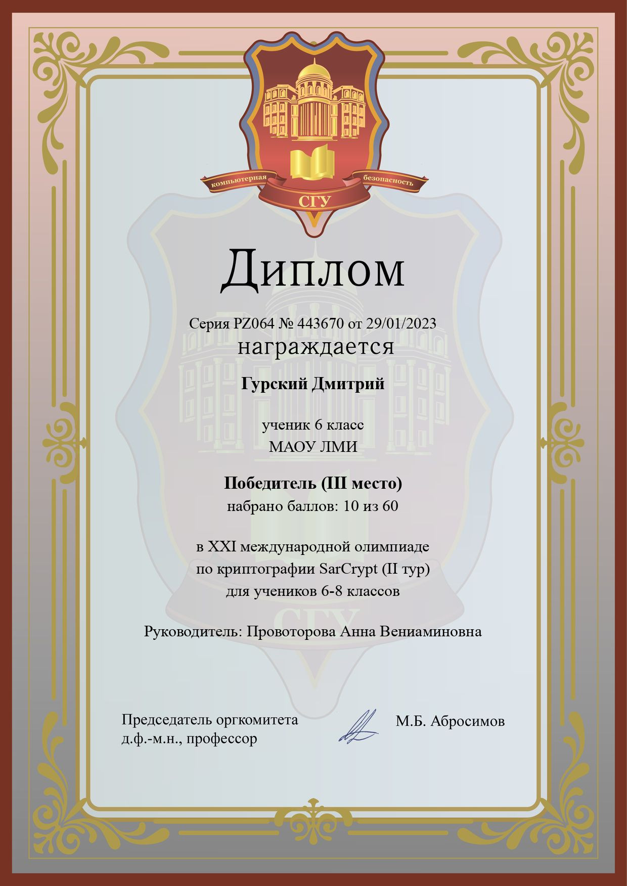 Название конкурса: XXI открытая олимпиада школьников и студентов по криптографии (II тур)Участник: Гурский Дмитрий