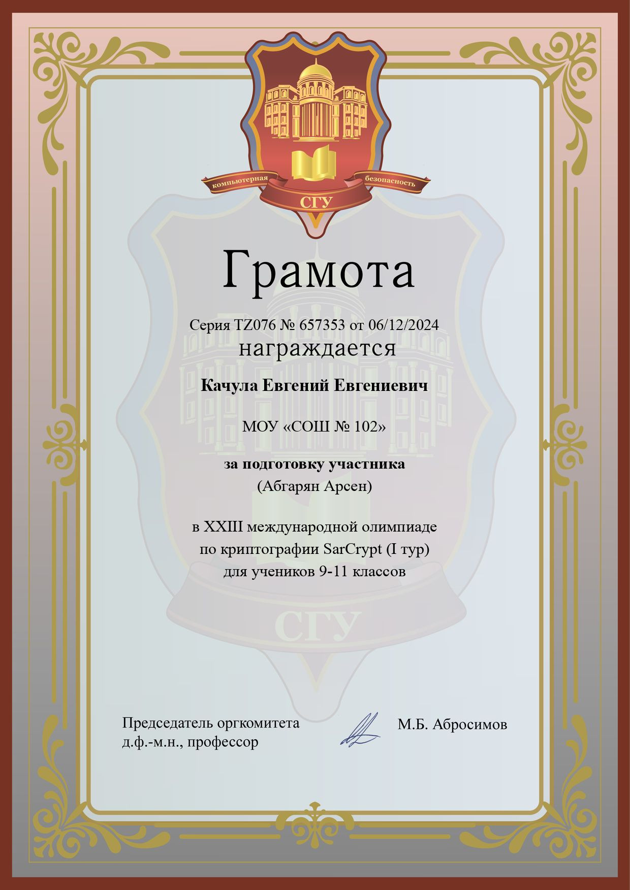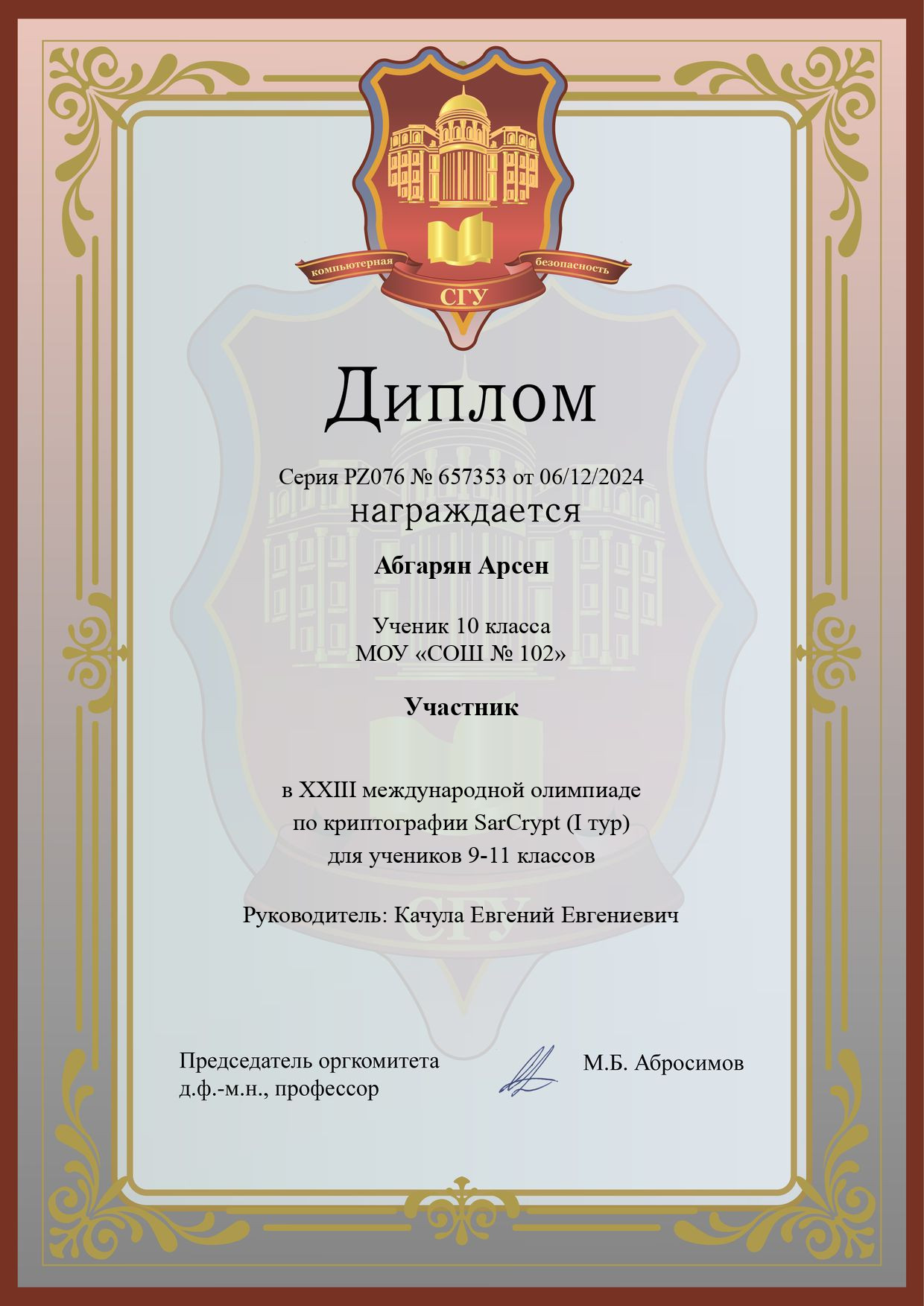 Название конкурса: XXIII открытая олимпиада школьников и студентов по криптографии (I тур)Участник: Абгарян Арсен