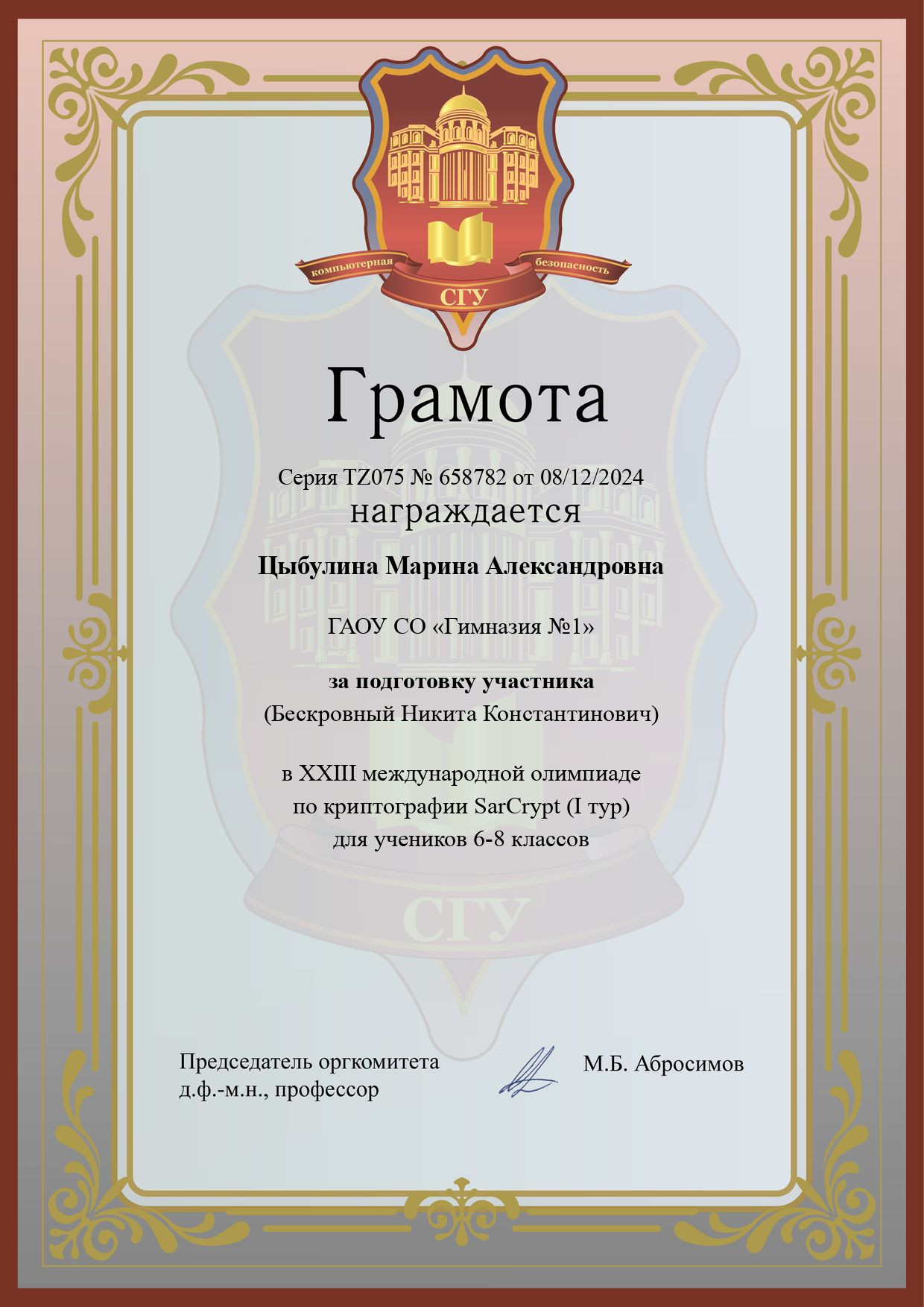 Название конкурса: XXIII открытая олимпиада школьников и студентов по криптографии (I тур)Участник: Бескровный Никита Константинович