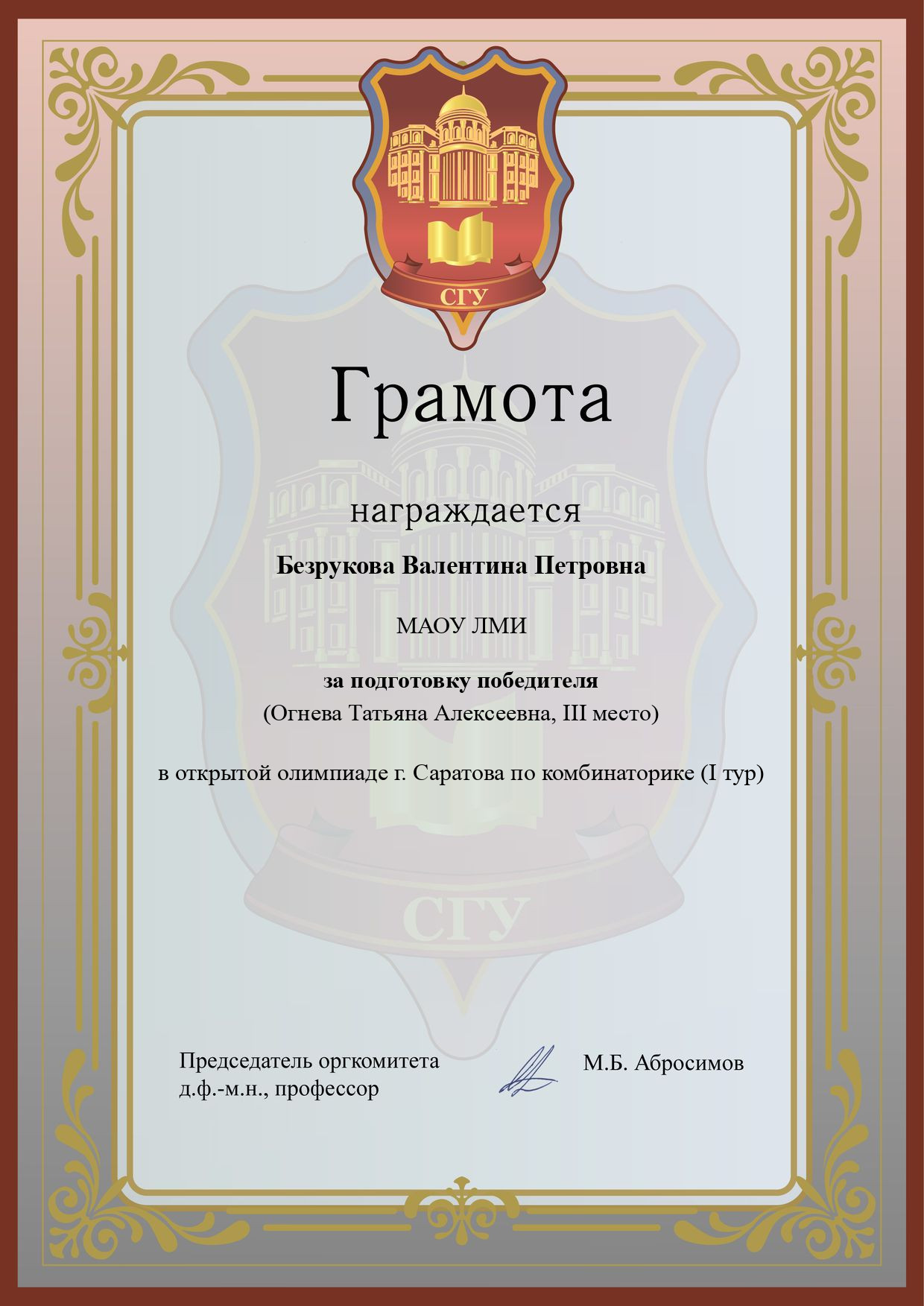 Название конкурса: Открытая олимпиада г. Саратова по комбинаторике (I тур)Участник: Огнева Татьяна Алексеевна
