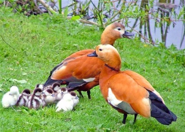 Вопрос № 1. Крупная утка рыжего цвета. У самца на шее чёрное кольцо. Гнездится в норах, недалеко от водоёмов.