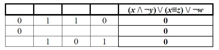 Вопрос № 1. Миша заполнял таблицу истинности функции (x /\ ¬y) \/ (x≡z) \/ ¬w, но успел заполнить лишь фрагмент из трёх различных её строк, даже не указав, какому столбцу таблицы соответствует каждая из переменных w, x, y, z.