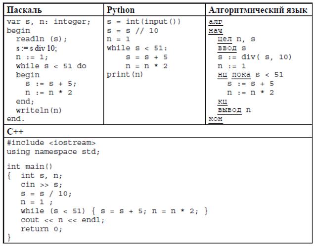 Вопрос № 1. Определите, при каком наибольшем введённом значении переменной s программа выведет число 64. Для Вашего удобства программа представлена на четырёх языках программирования.