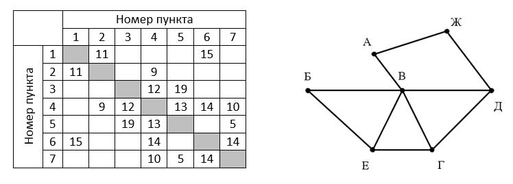 Вопрос № 1. На рисунке схема дорог Н-ского района изображена в виде графа, в таблицесодержатся сведения о протяжённости каждой из этих дорог (в километрах).Так как таблицу и схему рисовали независимо друг от друга, то нумерациянаселённых пунктов в таблице никак не связана с буквеннымиобозначениями на графе. Определите, какова протяжённость дорогииз пункта А в пункт В. В ответе запишите целое число – так, как оно указанов таблице.