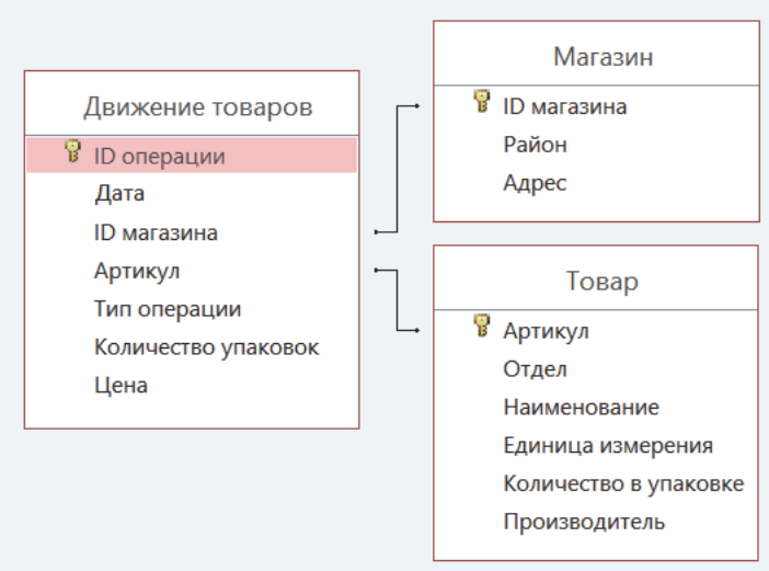 Таблица «Движение товаров» содержит записи о поставках товаров в магазины в течение первой декады июня 2021 г., а также информацию о проданных товарах. Поле Тип операции содержит значение Поступление или Продажа, а в соответствующее поле Количество упаковок внесена информация о том, сколько упаковок товара поступило в магазин или было продано в течение дня. Заголовок таблицы имеет следующий вид: ID операции, Дата, ID магазина, Артикул, Тип операции, Количество упаковок, Цена.